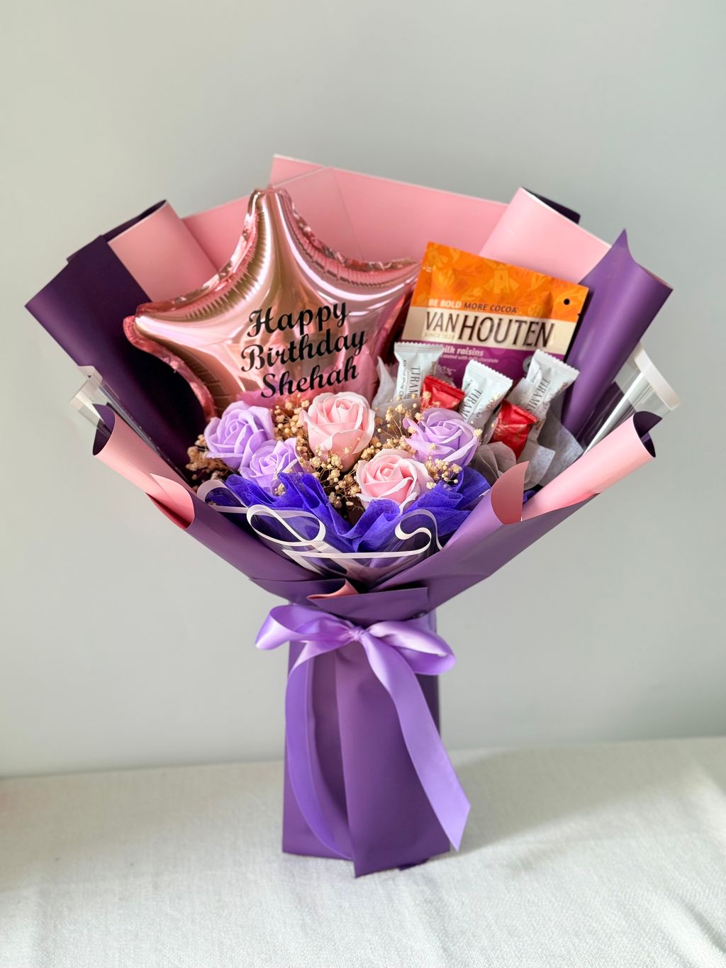 TREASURE bouquet features fresh scented soap rose and chocolate bars and small balloon paired with Deserts you can choose, either Scrumptious brownies or Delicious Cupcakes. Such perfect gift for someone with sweet tooth ☺️